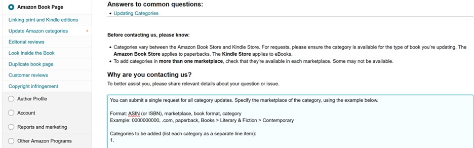 You will be taken to a screen where you indicate why you need support. Select “Amazon Book Page,” and then choose “Update Amazon Categories.”