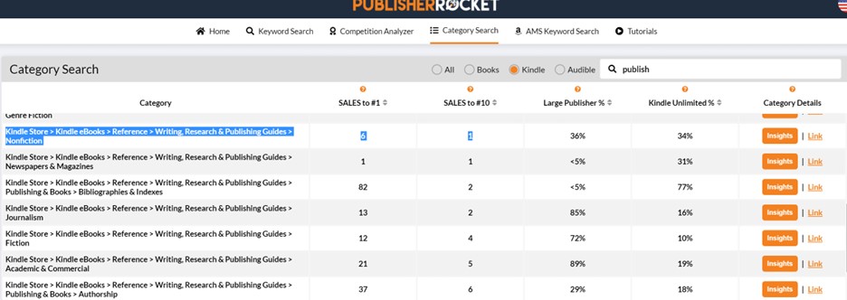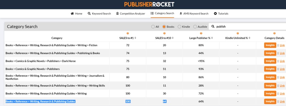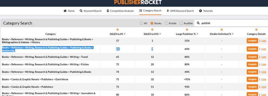 I began with a category search in Rocket for the word “publish.” I sorted the results by the number of book sales needed to get into the top ten of each category: